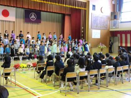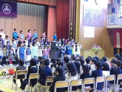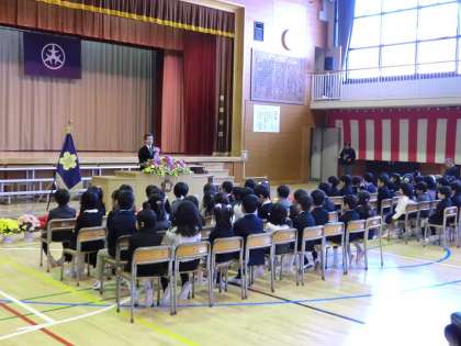 たくさんのご来賓・ご家族の皆様に見守られる中、友達と手をつないで元気よく入場したぴかぴかの1年生67名。あいさつや姿勢、話の聞き方も立派でした。