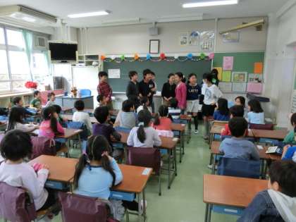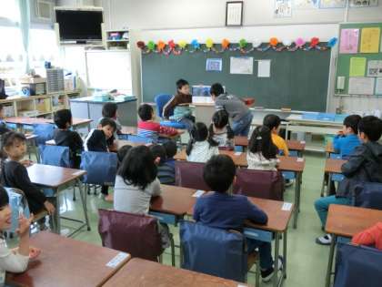 朝の時間、6年生が1年生の教室で、読み聞かせしたり、なぞなぞ・クイズなどを出したり工夫しながら1年生のお世話をしています。1年生も真剣に話を聞いたり問題に答えたり、楽しく朝の学校生活をスタートさせています。