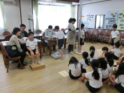 養護の先生から測定の説明があり、専科教員と保健事務職員が測定を担当し、子どもたちは順番に、身長・体重・座高の測定を受けています。