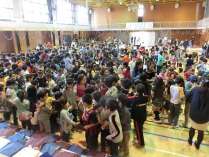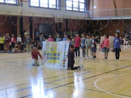 3年生からはプレゼントがありました。そのあと、全校でのゲーム「猛獣狩りに行こう」で、仲間づくりゲームを楽しみました。