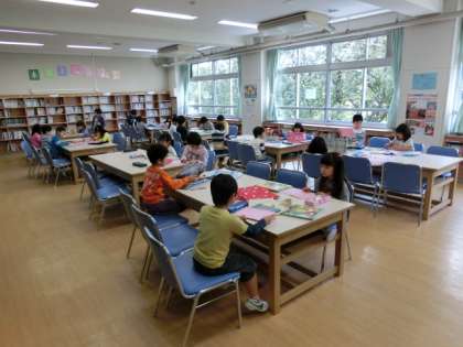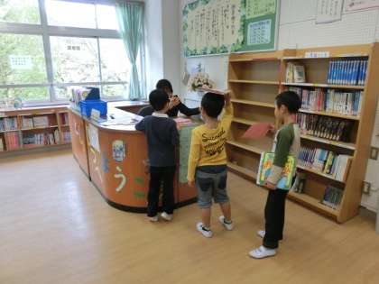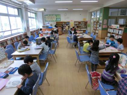 1年生が読書をしたり、本の返却や貸し出しを担任の先生といっしょに行ったりしていました。図書の時間は今日で2回目。図書室の使い方や本の返却・貸し出しの仕方にも慣れ、静かに本に親しんでいました。