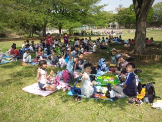 いよいよお弁当とおやつの時間です。食欲旺盛!グループで仲よく楽しい時間を過ごしています。