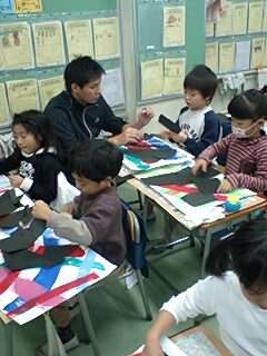 図工の時間です。「思い切ってちぎってみて下さい。」先生の言葉に、ドキドキしながら画用紙をちぎります。講師の岩谷正峰先生にもアドバイスをしてもらいました。