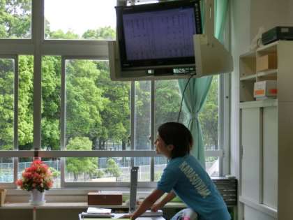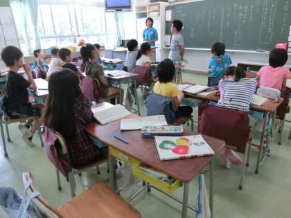 互いの発表の後には、相互に評価し合いながら友達の発表のよさを伝え合っていました。担任は、実物投影機をテレビモニターに接続し、ワークシートを拡大させ、記入の仕方・使い方を説明していました。子どもたちは映し出された映像に注目し、自分の学習活動に活かしていました。