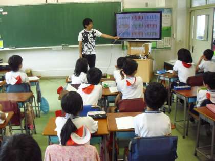 学習のめあては、「測定した結果を折れ線グラフに表す。」「晴れの日の気温の変化の特徴に気付く。」です。始めに各班が測定した結果を発表し合いました。担任がそれを聞きながら表計算ソフトを使って、その場で棒グラフを作成して電子黒板で提示しました。「先生のマジックだ。」と、児童は驚いたり喜んだりして学習への関心が高まったようです。