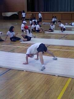 開脚後転の練習をしています。
