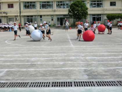今日の全校練習では、運動係による準備運動、応援団による午前の部の応援(エール交換と応援合戦)、そして全校競技「大玉送り」の練習を行いました。係児童の6年生が全体をリードし活躍しています。
