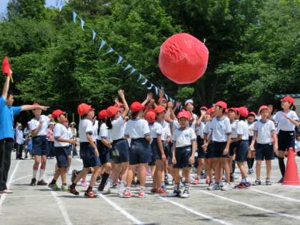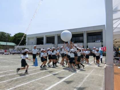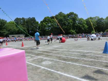6年生が補助役につき、ボールをコントロールしながら勝敗を競い合いました。全体が心を一つにして頑張った競技でした。
