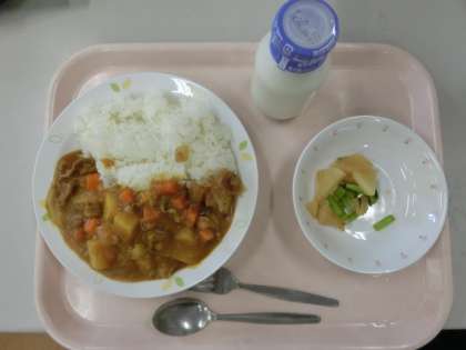 今日の献立は、子どもたちに人気のあるポークカレーライスです。