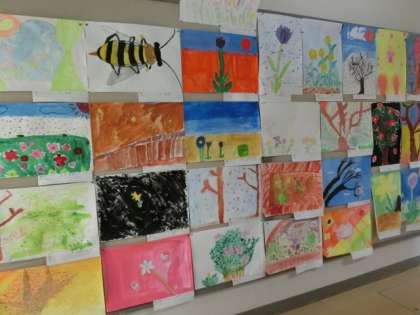 2階図工室周辺の掲示板やコーナーに、3年生と5年生が製作した作品が展示されています。