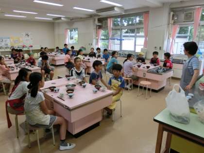 6年2組のみなさんが家庭科の調理実習で、「ご飯とみそ汁」の学習をしていました。