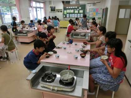 お釜を使ってご飯を炊き、煮干しを使ってみそ汁を作りました。グループで分担し協力して作り上げた「ご飯とみそ汁」が完成です。