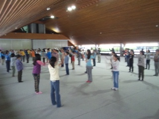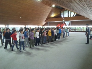 元気な子どもたちの声が、村の会堂に響きました。6時?に起床し、朝の仕度を済ませ集合しました。みんな元気です。朝の体操、先生方からの話や連絡がありました。一晩中降り続いた雨も今は上がっています。天候を見ながら一日のスケジュールを進めていく予定です。