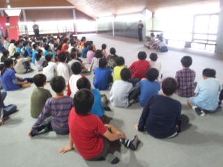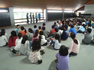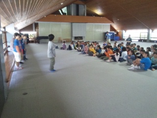 昼食後にまた雨が降り始め、楽しみにしていたますつかみ体験が中止となりました。代わりのプログラムは、生活班での「川場体験発表会」。各部屋で作戦を立て、村の会堂でその表現力を発表し合いました。どの班も想像力やチームワークを発揮し、楽しい発表会となりました。