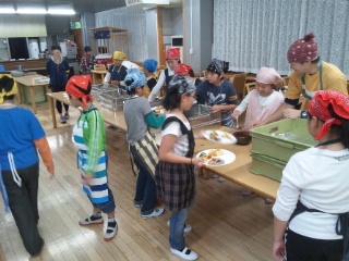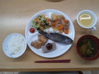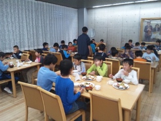 二日目の夕食が始まりました。食事係か活躍!予定通りの、いただきます!献立は、ご飯、鶏の照り焼き、肉じゃが、わかめサラダ、豆腐と青菜の味噌汁、こんにゃく、ミニトマト、そしてりんごジュース、さらにますの塩焼きです。食欲も旺盛な子どもたちです。