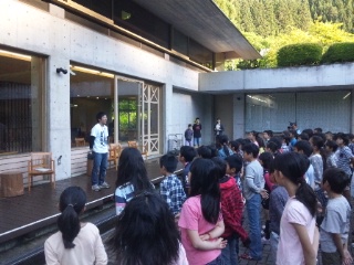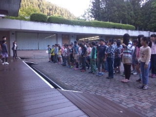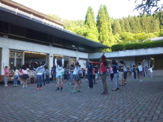 川場移動教室も三日目です。梅雨も中休み?雲一つない最高の天候となりました。お祭り広場で朝会を行いました。朝の元気なあいさつを交わし、少しひんやりとした空気を吸い込みながら体操をしました。心も体もスイッチオン!全員元気に一日のスタートです。