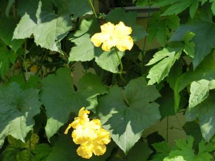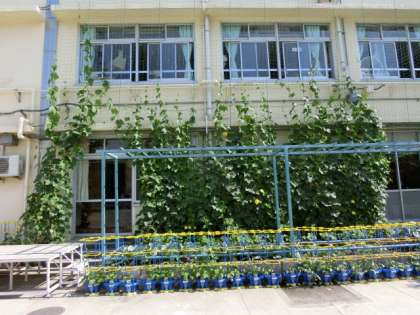 5月に設置したグリーンカーテンの植物、1年生が大切に育てている“あさがお”が順調に成長しています。1年生は、毎日の水やりを行い、観察も続けています。朝陽に輝く植物の成長が楽しみです。
