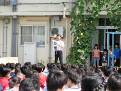 校長からは、まず「先週から水泳学習(プール開き)が始まりました。健康づくりや体力・泳力の向上につなげましょう。」と話しました。次に今日のキーワード「夏至」を示し、実際の昼夜の時間や私たちの感覚との違い、夏至の意味などについて伝えました。