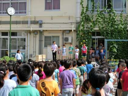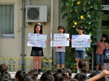 梅雨の晴れ間となり、今週も校庭で全校朝会を行うことができました。