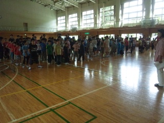 避難訓練の後、体育館に15校の全学級が集まり、開園式を行いました。自分のことは自分で、友達と仲よく、あいさつをしましょう、3つの話が代表の校長先生からありました。施設の方からは、思い出をたくさんつくって、との話がありました。また、児童代表の言葉を世田谷小学校の友達が上手に行い、大きな拍手が送られました。