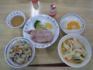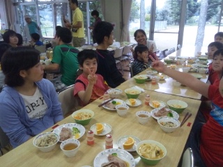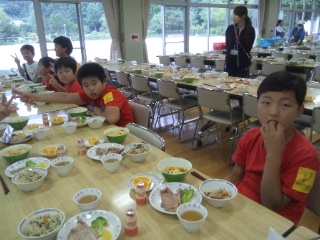 食堂に集合しました。「いただきます!」まで、カウントダウン中です。