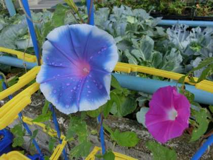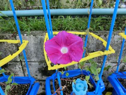 写真は、今朝7時に撮影したものです。休業日となった今日の学校は静かな朝で始まりました。1年生が生活科の学習で大切に育てている「アサガオ」の花も、美しく咲き始めました。