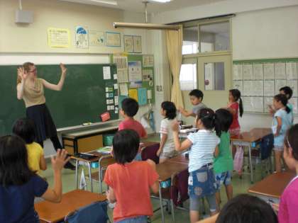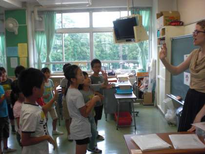 今日、外国人講師の先生が加わっての英語活動の時間がありました。挨拶から始まって、英語の歌、ダンス、ゲームなど楽しみました。