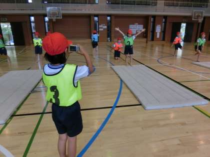 そこで3年生では、デジタルカメラメのムービー機能を子どもたちに活用させ、互いの動きを撮影し合いその場で見合うことで、動きのよさや自分で工夫したいところなどをつかみ、学習へ活かせる学習活動を取り入れる研究を進めています。