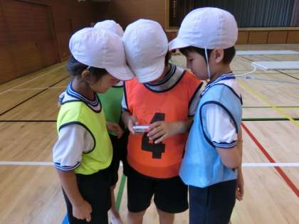 4日(金)1校時には3年2組で「後転とその発展技の開脚後転」の学習で、2校時には3年1組で、発展技の「側方倒立回転」の学習で、共にデジカメを活用してグループごとに動きの分析をし合いながら意欲的に取り組んでいました。また、全体でも「分析コーナー」で運動の方法を学んだり、友達のよい動きを紹介し合ったりしていました。一人ひとりの動きがメキメキと上達し、よい動きになっていく様子が見られました。子どもたちも嬉しいそうな表情を見せていました。
