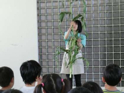 栄養士から、とうもろこしの作りや実のでき方、栄養などについての話を聞き、一人ひとりが、一本ずつ丁寧にとうもろこしの皮むきに挑戦しました。