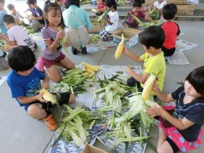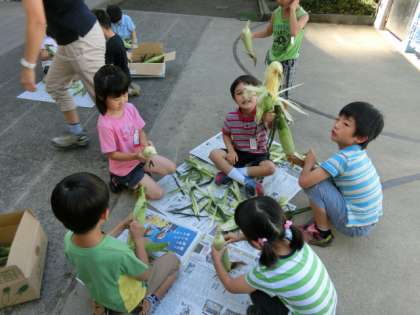 最初は戸惑っている様子でしたが、一枚一枚外側から皮をむき始め、中から“とうもろこし”が出てくると歓声が沸いていました。「甘い香りがするよ!」と教えてくれる子どもたち。たくさんの発見がありました。