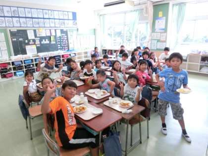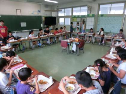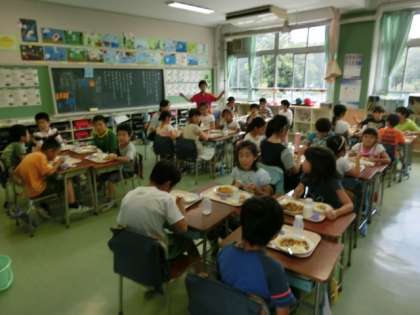 献立は、「なつやさいカレーライス、福神漬け、シャキシャキやさい、牛乳」です。上級生を中心に盛り付けをし、それぞれのグループでテーブルをつくり、上級生と下級生がいっしょに、担当の先生も加わり、子どもたちが大好きで、なす・トマト・かぼちゃなどたくさんの夏野菜が入ったカレーライスをいただきました。