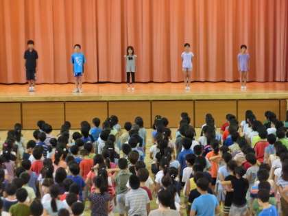 続いて、3年生と6年生の各学級代表の子どもたちが、“1学期を振り返って、心に残ったこと・頑張ったこと、これから取り組みたいこと・頑張りたいこと”についての発表がありました。感じたことや考えたことを自分の“ことば”で堂々とした発表ができ、全校から大きな拍手が送られました。