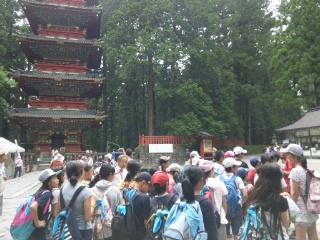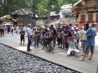 日光東照宮を見学しています。案内人の方の説明に耳を傾けながら、有名な世界遺産について学習しています。