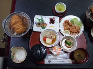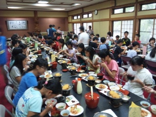 待ちに待った夕食の時間です。大広間で、楽しい会話とともに食事が進んでいます。食欲も旺盛。全員元気です。