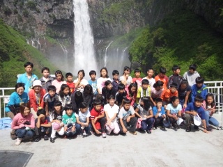 思い出の一枚。滝をバックに記念撮影をしました。