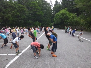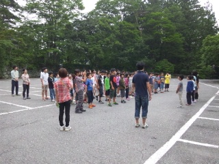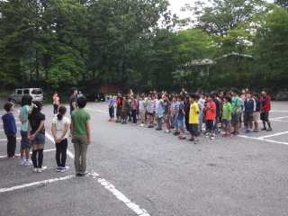 全員元気に、三日目を迎えました。曇っていますが降雨はなく、気持ちのよい朝です。近くの駐車場で朝会を行い、日光林間学園の最終日がスタートです。