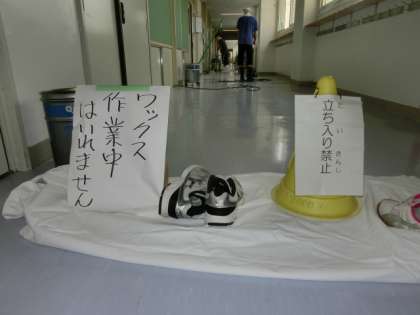 今日は、3階廊下のワックスがけを行いました。サマースクールや図書室開放、新BOP、その他の活動を見極めながら、夏休み中に校舎内の全ての床を綺麗にする予定です。2学期になって、子どもたちを受け入れる準備を進めていきます。