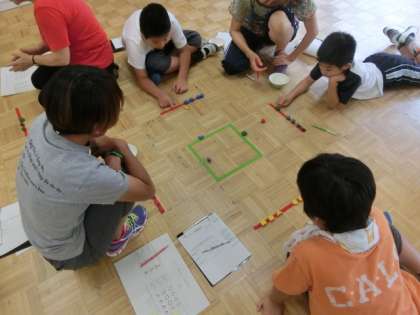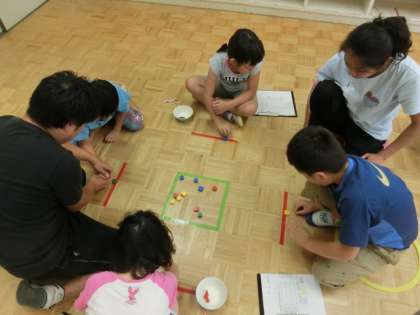 今日の午前中のプログラムでは、○や△や□のパズルを使った“数のゲーム”を楽しみました。ねらったコーナーに指を使ってパズルを弾き、どの形がいくつ入ったか得点を競い合いました。形によって1点から5点までと配点がちがうため、ねらいをつけて真剣に取り組む姿が見られました。