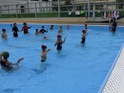 午後は、水遊び・水泳を楽しみました。歩いたり走ったり、潜ったり浮いたり、みんなで踊ったり、最後に“宝探しゲーム”をしたり、仲よく元気よく運動に取り組んでいました。