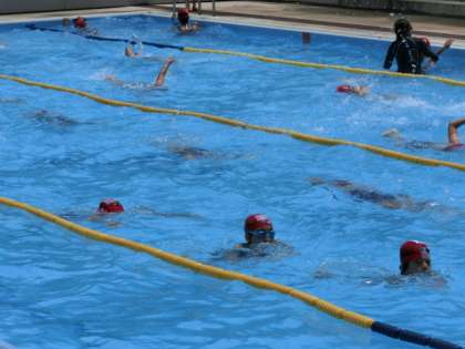 クロールや平泳ぎの形を練習する、ビート板を使って平泳ぎの脚の蹴りの練習をする、長く泳げるようになるための練習をするなど、一人ひとりがめあてに向かって練習し、友達と教え合ったり、または先生や指導員の方々にアドバイスをもらったりしながら頑張っていました。