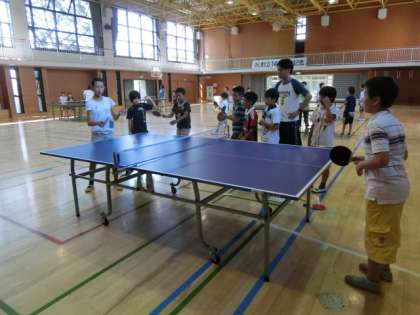 卓球教室では、体育館に卓球台を用意し、グループをつくってサーブやレシーブの基本練習をしたり、簡単なゲームを通してルールを学んだりしていました。暑さを感じる体育館でしたが、楽しく1日目の活動を終えました。引き続き明日も活動があります。明日が楽しみな子どもたちです。