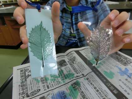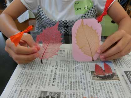 理科実験教室では、昨日取り出して色染めをした葉脈を使って、標本としての“しおり”づくりをしました。緑色をした葉っぱが、見事な葉脈として姿を現し、素敵な“しおり”が完成しました。その作品からの紹介です。