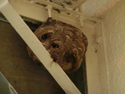 校舎北側の駐輪場の屋根の下に、スズメバチの巣が発見されました。