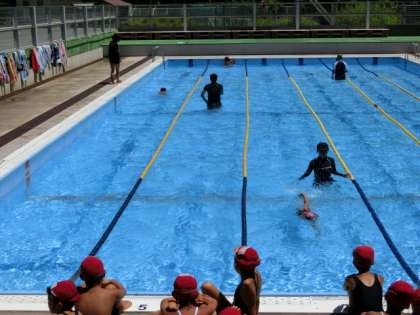 特に1年生の進歩には目を見張るものがありました。教員や指導補助員の励ましやリードを受けながら、力いっぱい先の方まで泳ぎきる子も。練習以上の成果をどの子も出していました。
