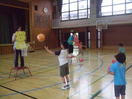 午後は天候不良のため、水泳は中止して、体育館でボール運動をしました。ゴールにボールが入るととても嬉しそうに活動する様子が見られました。