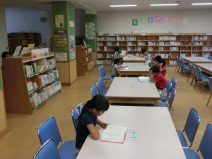 水泳教室への参加を予定していた子どもたちや、算数教室への参加の前後の時間を利用して図書室へ来る子どもたちがたくさんいました。窓を開けた涼しい図書室で、静かに読書を楽しんでいました。開放担当の保護者の方々も子どもたちとともに読書をされていました。
