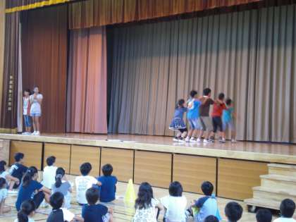 ルールは、たてわり班の全員が、前の友達の肩に手を置き連結します。そして、集会委員が「言うこと一緒!やること一緒!前・後ろ・左・右」などと指示を出します。全員が息をそろえて、指示通りに動くことができたら大成功です。