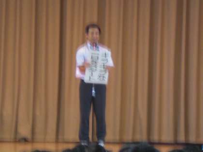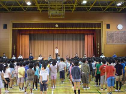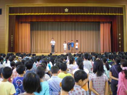 始めに校長先生から、今年の水泳について、あいさつ週間・あいさつキャンペーンについてのお話のあと、笑顔・元気よく・声を出して・キラキラな1日をスタート、というキーワードのお話がありました。