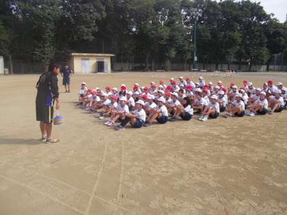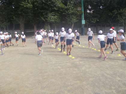 上祖師谷中の体育の先生2名に様々な陸上トレーニングを教えていただいたり、楽しい鬼ごっこをしたりとたくさんの汗をかきながら、体を動かしました。また、中学校の広いグラウンドを利用して、100mを直線で走るという体験をし、10月に行われる連合運動会への意欲を高めました。
